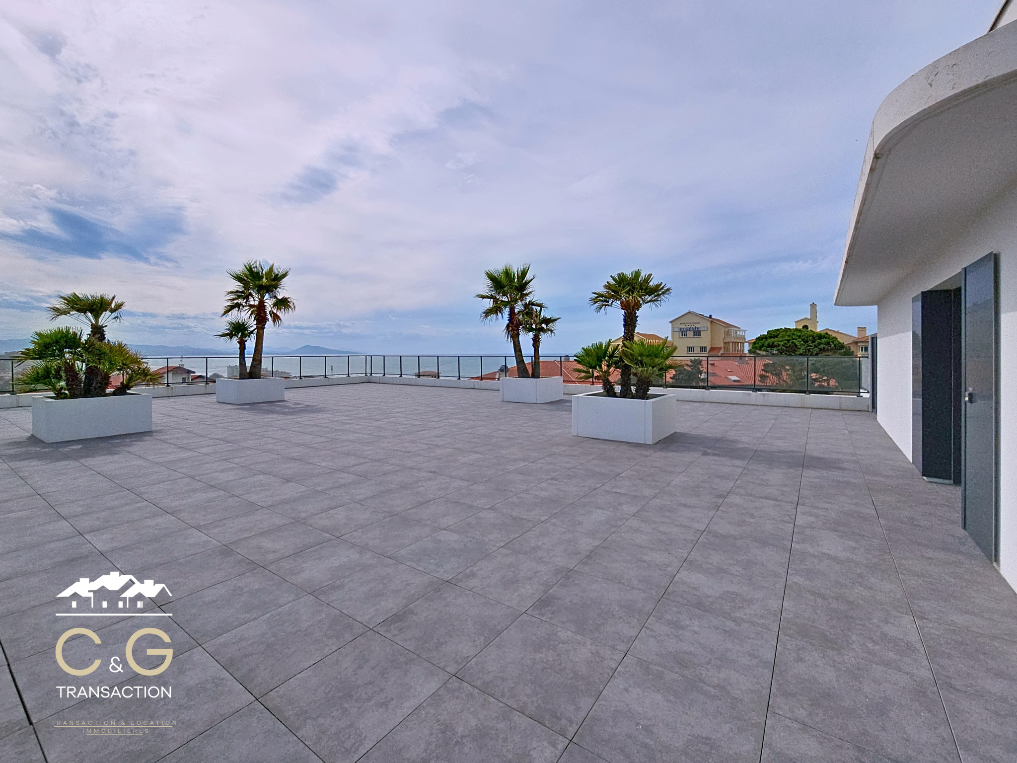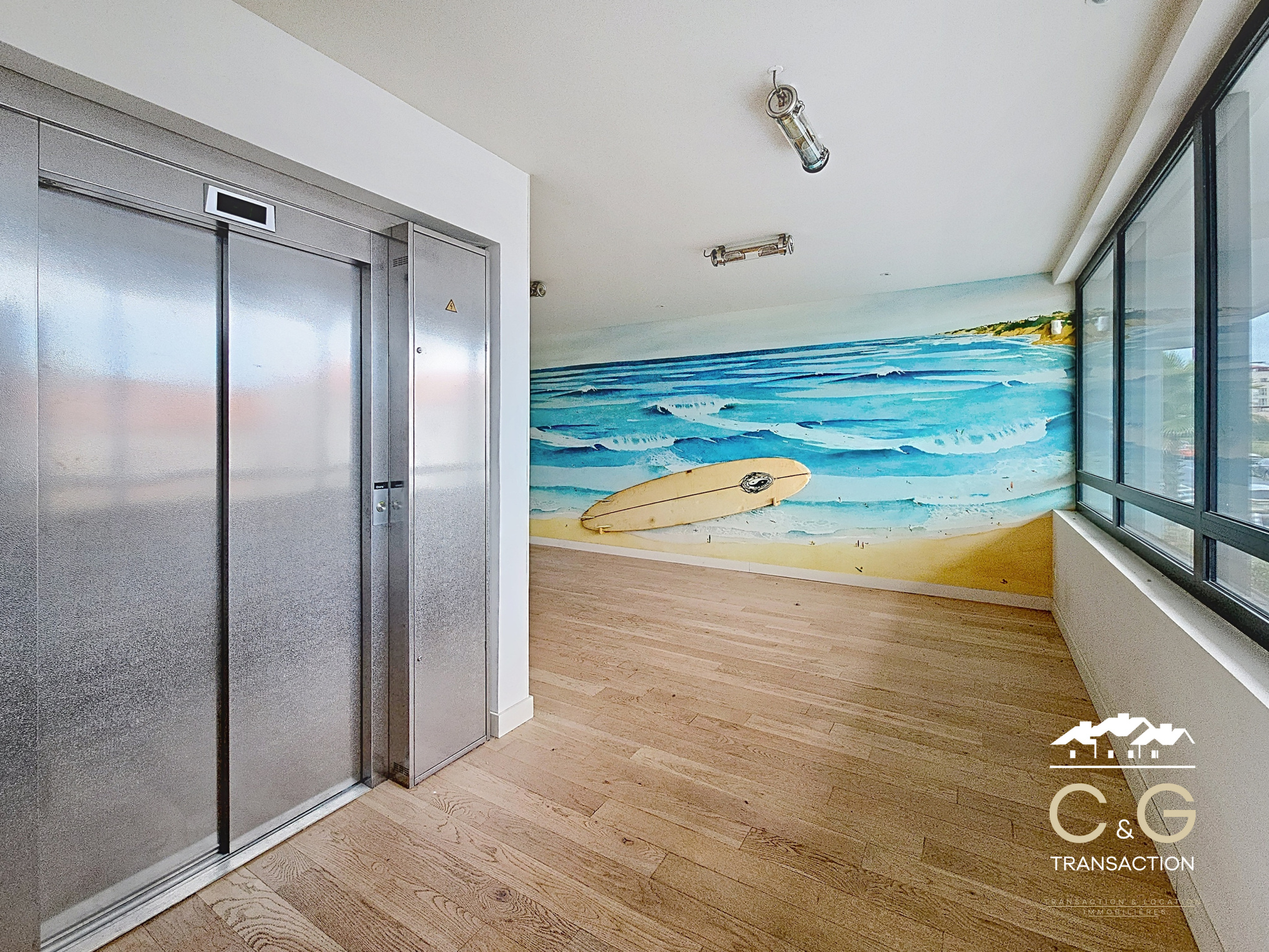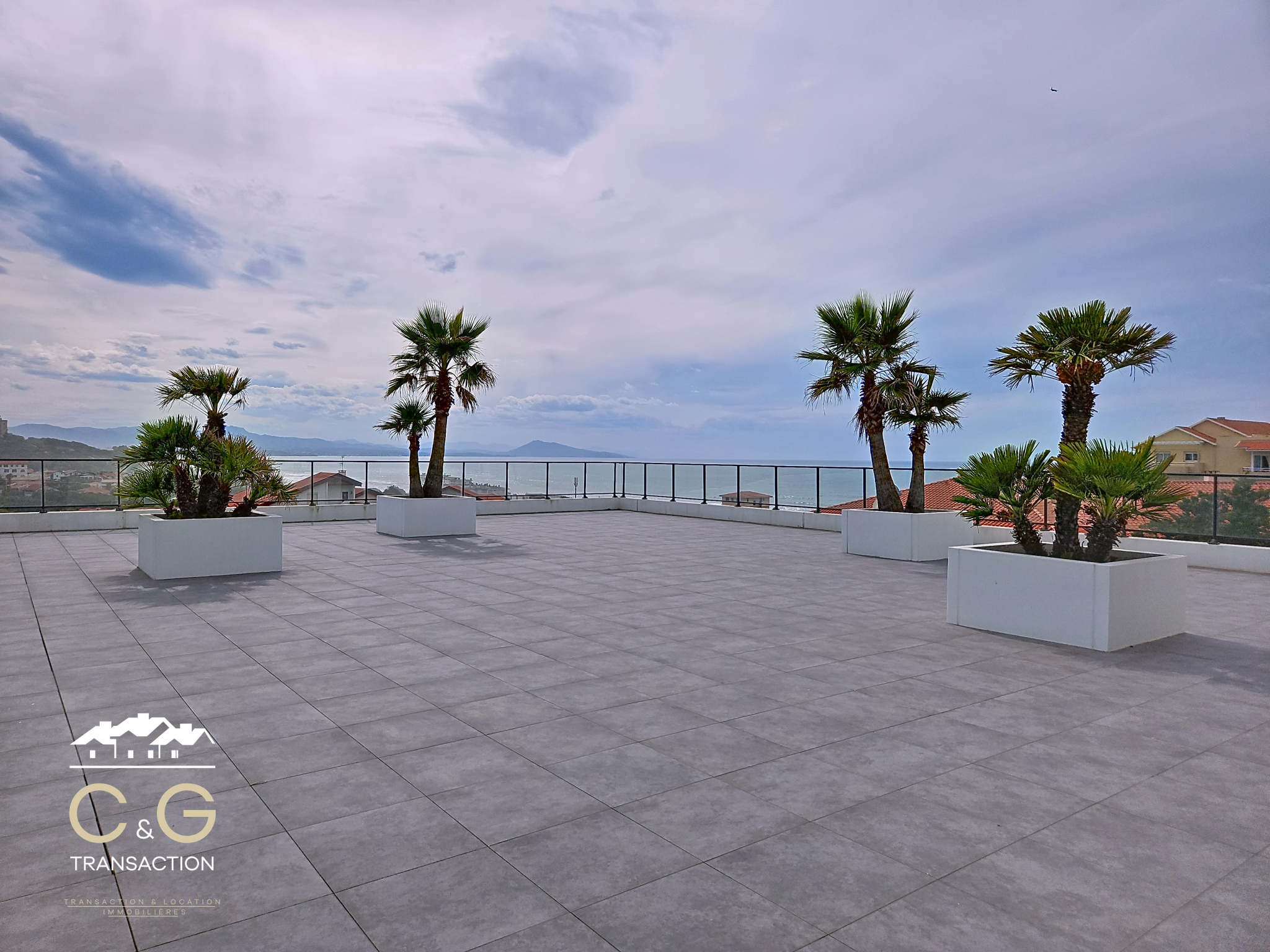 Au dernier étage, via l’ascenseur, une splendide terrasse – en copropriété – un rooftop, vue sur océan et Pyrénées, qui a déjà servi à de l’évènementiel.